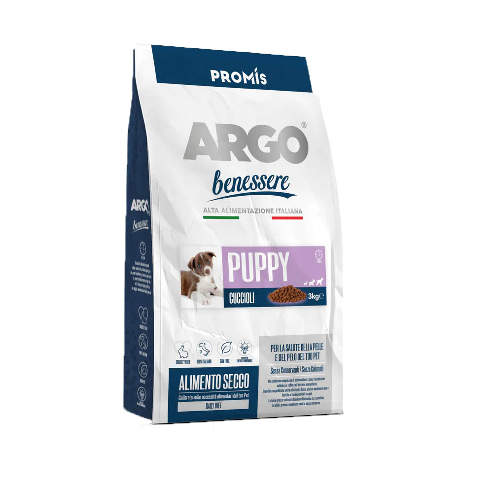 Le crocchette premium per cuccioli Argo Benessere sono un alimento completo e bilanciato, pensato per accompagnare la crescita dei cuccioli in modo sano e naturale. Realizzate in Italia da una filiera corta, garantiscono qualità, freschezza e un ottimo rapporto qualità-prezzo. Grazie alla presenza di ingredienti selezionati e nutrienti essenziali, supportano lo sviluppo muscolare, articolare e immunitario del tuo cane.