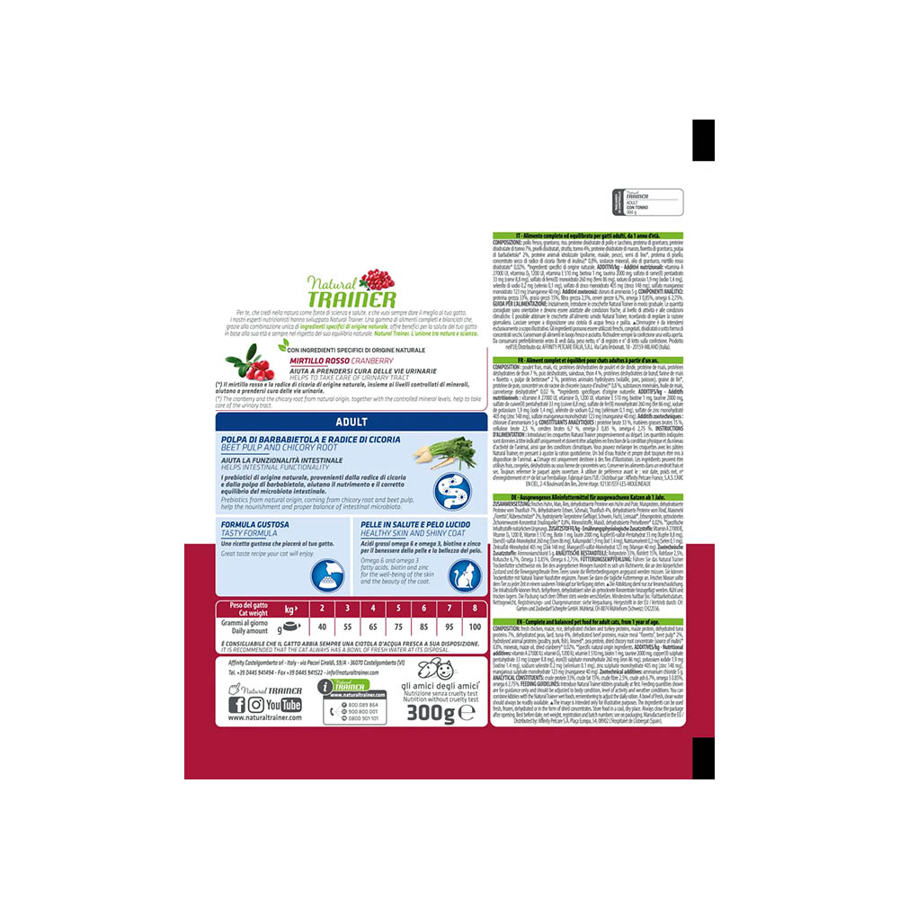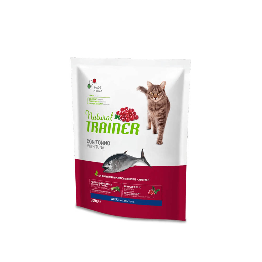 Scopri Natural Trainer ADULT TONNO 300g, l’alimento completo pensato per il benessere quotidiano del tuo gatto adulto. Grazie ai prebiotici naturali estratti dalla radice di cicoria e dalla polpa di barbabietola, questo prodotto favorisce una corretta funzionalità intestinale e sostiene l’equilibrio del microbiota. Il mirtillo rosso, combinato con la cicoria e un apporto controllato di minerali, contribuisce alla salute delle vie urinarie, aiutando a prevenire fastidi comuni nei felini.