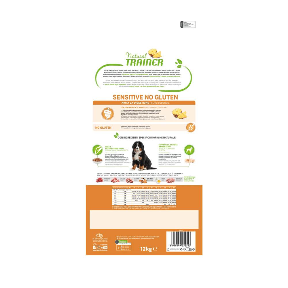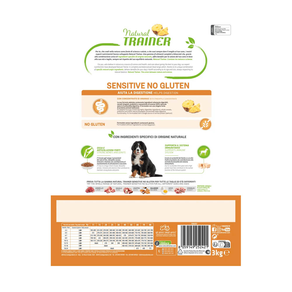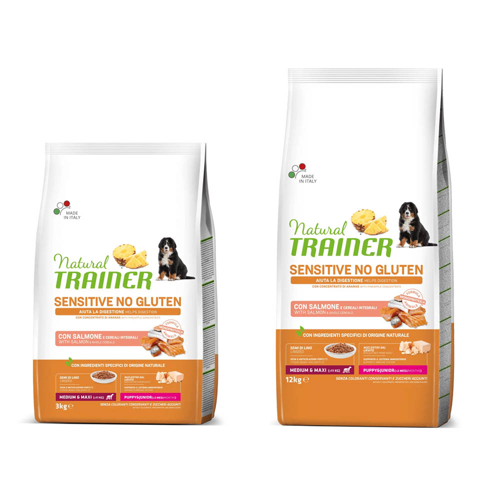 Natural Trainer Sensitive No Gluten Puppy e Junior con Salmone è disponibile nei formati da scegliere 3Kg e 12Kg, perfetti per accompagnare il tuo cucciolo in ogni fase della crescita. Infine, puoi scegliere il formato più adatto alle tue esigenze: 3Kg e 12Kg, per offrire al tuo cane un’alimentazione completa, sicura e gustosa ogni giorno.